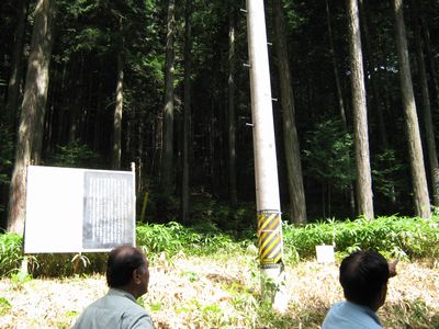 ・くじによって、参加者全員の原木が決まったところで、いよいよ山の中に入ります。道路の脇にはなにやら看板が。
