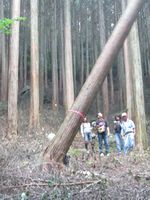 ・この素晴らしい山で参加者ご家族が選んだ大黒柱用原木の伐採をおこないます。長期間、この素晴らしい東濃檜を育てられた山側の方達はちょっと複雑な気持ちなのかもしれませんね。まるで、かわいい愛娘をお嫁にだすような・・・。